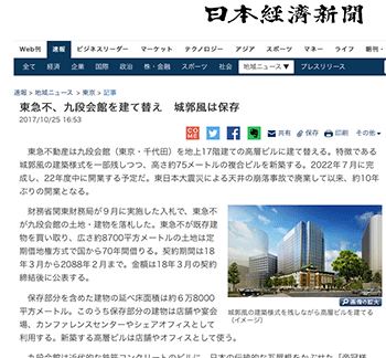 東急不動産による九段会館(東京・千代田)の建て替え計画について取り上げている記事が、日本経済新聞に掲載されています。