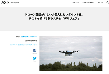 ロボット&ドローン「ドローン配送がいよいよ個人にピンポイント化。テストを続ける新システム「デリブエア」」というケンブリッジ・コンサルタンツによるデリブエアと呼ばれるシステムについて取り上げている記事が、Web Magazine AXISに掲載されています。
