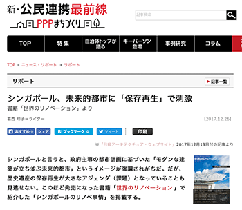 「シンガポール、未来的都市に「保存再生」で刺激」というシンガポールのリノベ事情について取り上げている記事が、新・公民連携最前線 PPPまちづくりに掲載されています。