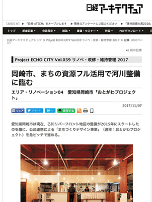 リノベーション・空間再生「岡崎市、まちの資源フル活用で河川整備に臨む エリア・リノベーション04 愛知県岡崎市「おとがわプロジェクト」」という愛知県岡崎市の事例を紹介している記事が、日経アーキテクチュアに掲載されています。