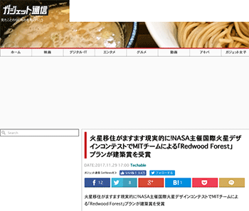 「火星移住がますます現実的に!NASA主催国際火星デザインコンテストでMITチームによる「Redwood Forest」プランが建築賞を受賞」というNASA主催の国際火星デザインコンテストの結果について取り上げている記事が、ガジェット通信 GetNewsに掲載されています。