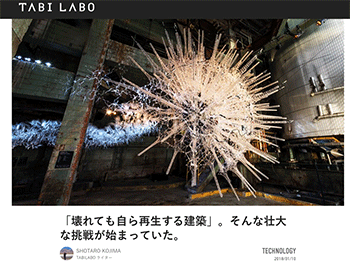 建築「「壊れても自ら再生する建築」。そんな壮大な挑戦が始まっていた。」というPhilip Beesleyさんの作品について取り上げている記事が、TABI LABOに掲載されています。