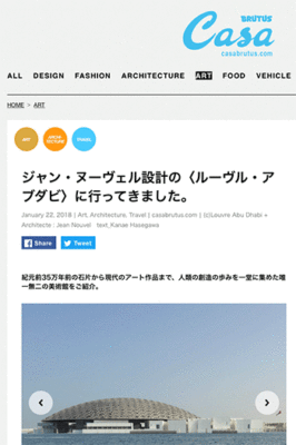 「ジャン・ヌーヴェル設計の〈ルーヴル・アブダビ〉に行ってきました。」というフランスの〈ルーヴル〉初の国外美術館ルーヴル・アブダビについて取り上げている記事が、Casa BRUTUSに掲載されています。