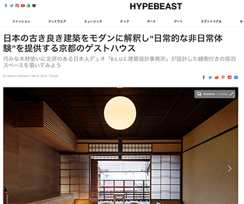 「日本の古き良き建築をモダンに解釈し“日常的な非日常体験”を提供する京都のゲストハウス 」というB.L.U.E.建築設計事務所が手がけた京都のゲストハウスについて取り上げている記事がHYPEBEAST.JPに掲載されています。