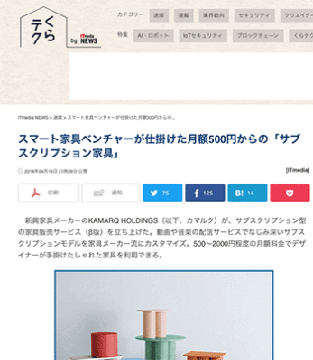 家具メーカーのKAMARQ HOLDINGSによる、サブスクリプション型の家具販売サービス(β版)について取り上げている記事が、 ITmedia NEWSに掲載されています。