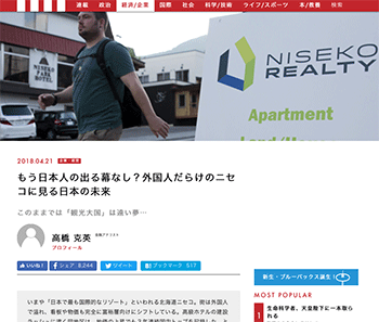 「もう日本人の出る幕なし?外国人だらけのニセコに見る日本の未来」という北海道ニセコについて取り上げている記事が、現代ビジネスに掲載されています。
