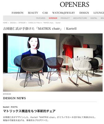 ミラノサローネ2018にて発表されたという吉岡徳仁氏がデザインした、Kartell「MATRIX chair」について取り上げている記事が、OPENERSに掲載されています。