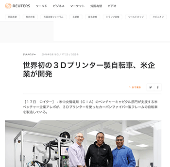 アメリカのアレボ社による、3Dプリンターを使ったカーボンファイバー製フレームの自転車について取り上げている記事が、ロイターに掲載されています。
