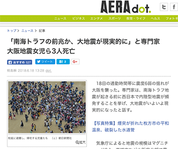 「「南海トラフの前兆か、大地震が現実的に」と専門家 大阪地震女児ら3人死亡」という今朝の大阪地震に関連する内容の記事が、AERA dot.に掲載されています。