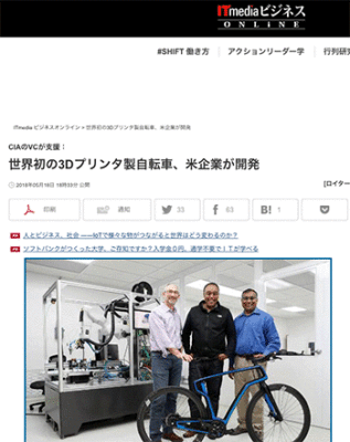 「世界初の3Dプリンタ製自転車、米企業が開発」という3Dプリンターを使ったカーボンファイバー製フレームの自転車について取り上げている記事が、 ITmedia ビジネスオンラインに掲載されています。