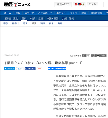 「千葉県立の83校でブロック塀、建築基準満たさず」という千葉県のニュースを取り上げている記事が、産経ニュースに掲載されています。