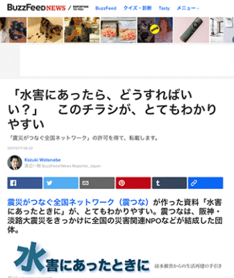 「「水害にあったら、どうすればいい?」 このチラシが、とてもわかりやすい」という震災がつなぐ全国ネットワーク(震つな)が作った資料「水害にあったときに」についての内容などを紹介している記事が、BuzzFeed Newsに掲載されています。