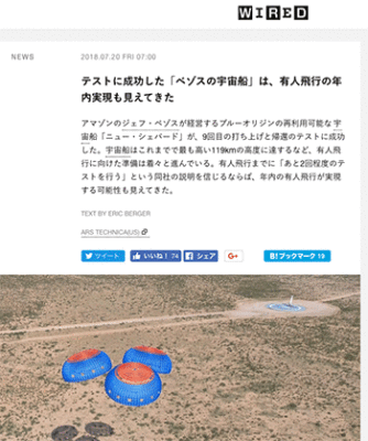 ブルーオリジンの再利用可能な宇宙船「ニュー・シェパード」について取り上げている記事が、WIRED.jpに掲載されています。