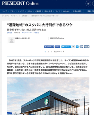 「”過疎地域”のスタバに大行列ができるワケ」という北海道釧路市の事例にちて取り上げている記事が、プレジデントオンラインに掲載されています。