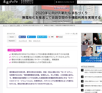 まちづくり「2020年に向けた新たなまちづくり 無電柱化を推進して街路空間の多機能利用を実現する」というパナソニックと東京電力の取り組みについて取り上げている記事が、未来コトハジメに掲載されています。