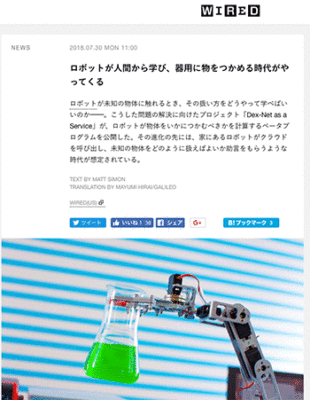 ロボット&ドローン「ロボットが人間から学び、器用に物をつかめる時代がやってくる」という記事が、WIRED.jpに掲載されています。