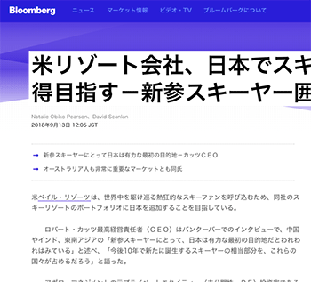 「米リゾート会社、日本でスキー場取得目指す-新参スキーヤー囲い込み」という記事が、Bloombergに掲載されています。