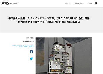 「平田晃久が設計した「ナインアワーズ浅草」が2018年9月21日(金)開業 店内にはオスロのカフェ「FUGLEN」の国内2号店も出店」という先月オープンしたナインアワーズ浅草について取り上げている記事が、Web Magazine AXISに掲載されています。