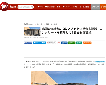 製品「米国の海兵隊、3Dプリンタで兵舎を建設–コンクリートを積層して1日あれば完成」という3Dプリンタに関するニュースを取り上げている記事が、CNET Japanに掲載されています。