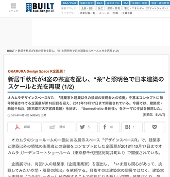 日本建築オカムラ ガーデンコートショールーム(東京都千代田区紀尾井町4-1)のオカムラデザインスペースRで、「建築家と建築以外の領域の表現者との協働」を基本コンセプトに毎年開催されてる企画展(10月17日まで)の模様をレポートしている記事が、BUILTに掲載されています。