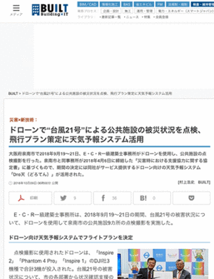 大阪府泉南市で2018年9月19~21日、E・C・R一級建築士事務所がドローンを使用し、公共施設の点検撮影を行ったことについて取り上げている記事が、BUILTに掲載されています。