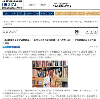 「「まつもと市民芸術館は一か八かだった」 伊東豊雄氏がコンペ振り返る」というJIA建築家クラブ連続講座の模様をレポートしている記事が、建設通信新聞Digitalに掲載されています。