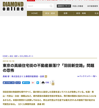 「東京の高級住宅街の不動産暴落!?「羽田新空路」問題の恐怖」という東京でのニュースを取り上げている記事が、ダイヤモンド・オンラインに掲載されています。
