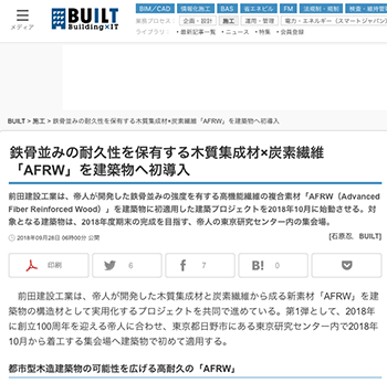 「鉄骨並みの耐久性を保有する木質集成材×炭素繊維「AFRW」を建築物へ初導入」という前田建設工業による建築プロジェクトについて取り上げている記事が、 BUILTに掲載されています。