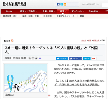 まちづくり「スキー場に活気!ターゲットは「バブル経験の親」と「外国人」」という国内のスキーリゾートに関する記事が、財経新聞に掲載されています。