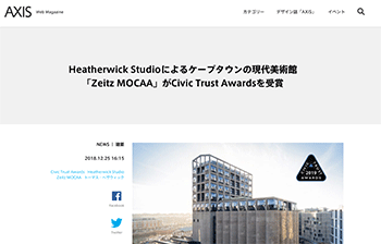 建築Heatherwick Studioが手がけた南アフリカ・ケープタウンの「Zeitz MOCAA」が2019年度 Civic Trust Awardsを受賞したことを伝えている記事が、Web Magazine AXISに掲載されています。