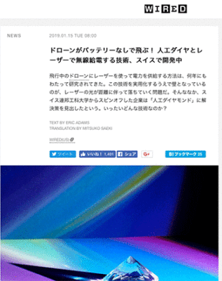 「ドローンがバッテリーなしで飛ぶ! 人工ダイヤとレーザーで無線給電する技術、スイスで開発中」というレイクダイヤモンド(LakeDiamond)の研究者たちによる技術について取り上げている記事が、WIRED.jpに掲載されています。