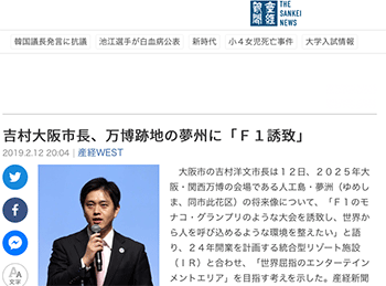 都市イベント・構想「吉村大阪市長、万博跡地の夢州に「F1誘致」」という大阪でのニュースを取り上げている記事が、産経ニュースに掲載されています。