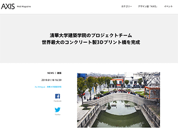 清華大学建築学院のプロジェクトチームが、上海市に完成させたコンクリート製の3Dプリント歩道橋について取り上げている記事が、Web Magazine AXISに掲載されています。