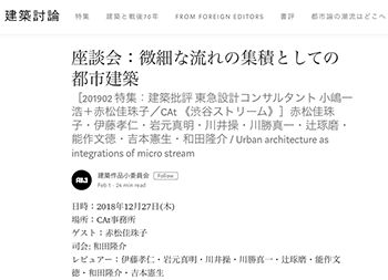 渋谷ストリームに関する座談会「微細な流れの集積としての都市建築」(参加者:赤松佳珠子・伊藤孝仁・岩元真明・川井操・川勝真一・辻琢磨・能作文徳・吉本憲生・和田隆介)の模様をレポートしている記事が、建築討論に掲載されています。
