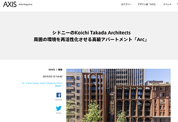 Koichi Takada Architectsが設計によるシドニーで建設中の高級アパートメント「Arc」について取り上げている記事が、Web Magazine AXISに掲載されています。