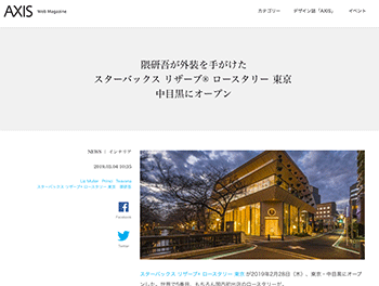 建築隈研吾氏が外装を手がけた「スターバックス リザーブ® ロースタリー 東京」について取り上げている記事が、Web Magazine AXISに掲載されています。