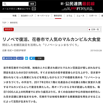 「リノベで復活、花巻市で人気のマルカンビル大食堂」という岩手県花巻市の事例を取り上げている記事が、新・公民連携最前線|PPPまちづくりに掲載されています。