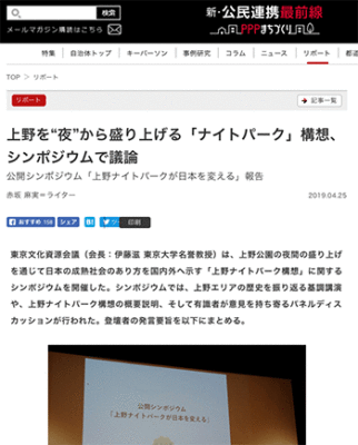 まちづくり「上野を“夜”から盛り上げる「ナイトパーク」構想、シンポジウムで議論」という公開シンポジウム(上野ナイトパークが日本を変える)の模様をレポートしている記事が、新・公民連携最前線|PPPまちづくりに掲載されています。
