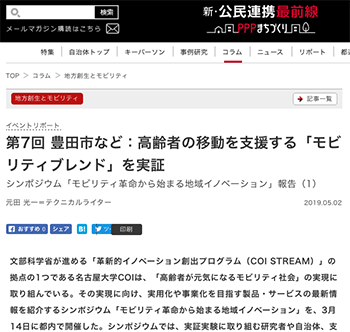 「豊田市など:高齢者の移動を支援する「モビリティブレンド」を実証」というシンポジウム(モビリティ革命から始まる地域イノベーション)の模様をレポートしている記事が、新・公民連携最前線|PPPまちづくりに掲載されています。