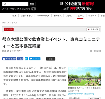 まちづくり「都立木場公園で飲食業とイベント、東急コミュニティーと基本協定締結」という都立木場公園に関するニュースを取り上げている記事が、新・公民連携最前線|PPPまちづくりに掲載されています。