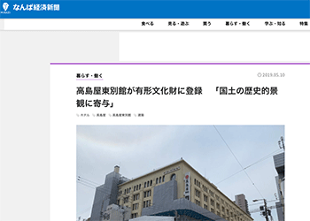 大阪市浪速区にある高島屋東別館が、国の有形文化財(建造物)に登録されたことを伝えている記事が、なんば経済新聞に掲載されています。