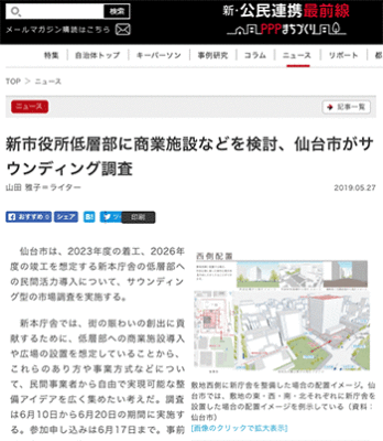 まちづくり「新市役所低層部に商業施設などを検討、仙台市がサウンディング調査」という仙台市の事例を取り上げている記事が、新・公民連携最前線|PPPまちづくりに掲載されています。