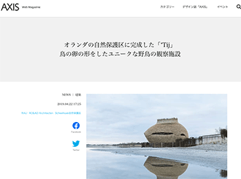 建築RO&AD ArchitectenRAUによるオランダの自然保護区に完成した野鳥の観測施設「‘Tij」について取り上げている記事が、AXISに掲載されています。