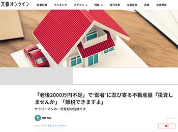 都市とメディア「「老後2000万円不足」で“弱者”に忍び寄る不動産屋「投資しませんか」「節税できますよ」」という牧野知弘氏による記事が、文春オンラインに掲載されています。