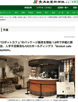 UCCとQBIT Robotics社によるカフェパッケージ「&robot cafe system」について取り上げている記事が、食品産業新聞社ニュースに掲載されています。