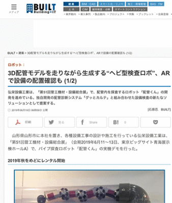ロボット&ドローン弘栄設備工業による、パイプ探査ロボット「配管くん」について取り上げている記事が、BUILTに掲載されています。