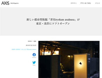 日本旅館・古民家再生東京・浅草観音堂裏エリアに7月にオープンした、インバウンド向けの宿泊施設「茶室ryokan asakusa」(建築デザインは建築家の前田圭介)について取り上げている記事が、AXISに掲載されています。