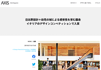 イタリアの国際的デザインコンペティション「A’ Design Award & Competition 2019(エーダッシュデザインアワード&コンペティション2019)」において、日比野設計+幼児の城が設計監理を行った園舎が受賞したことを取り上げている記事が、AXISに掲載されています。