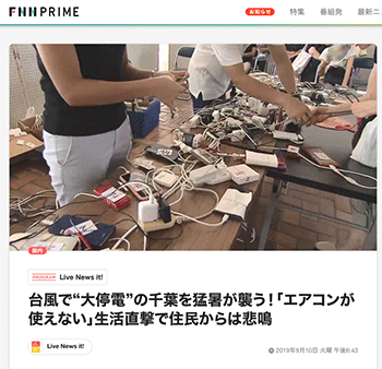 都市防災「台風で“大停電”の千葉を猛暑が襲う!「エアコンが使えない」生活直撃で住民からは悲鳴」という台風15号の影響で、60万軒以上が停電した千葉県内の様子をレポートしている記事が、FNN.jpプライムオンラインに掲載されています。