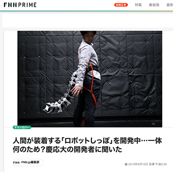 「人間が装着する「ロボットしっぽ」を開発中…一体何のため?慶応大の開発者に聞いた」という慶應大学大学院の研究チームによるロボット尻尾について取り上げている記事が、FNN.jpプライムオンラインに掲載されています。